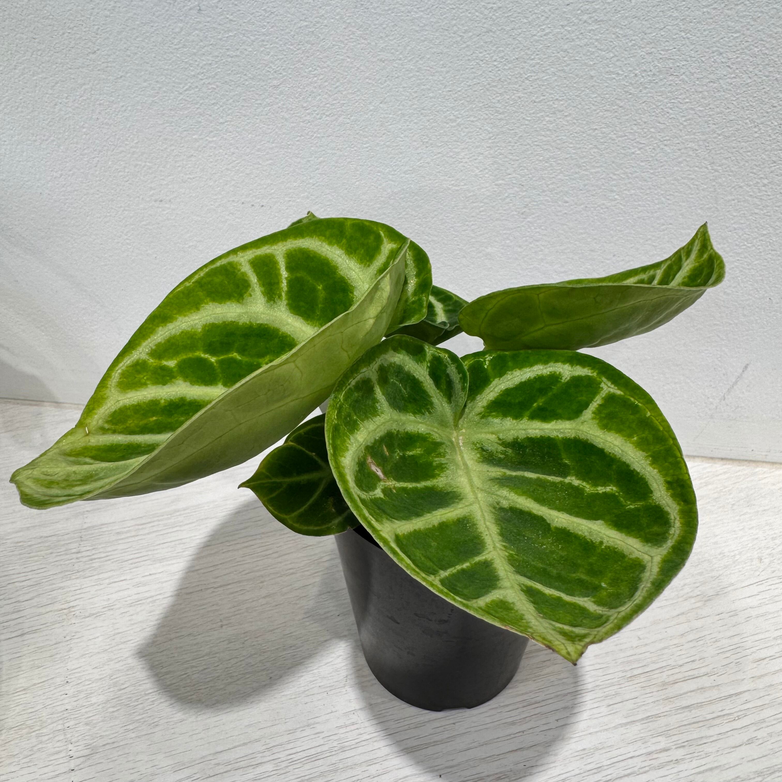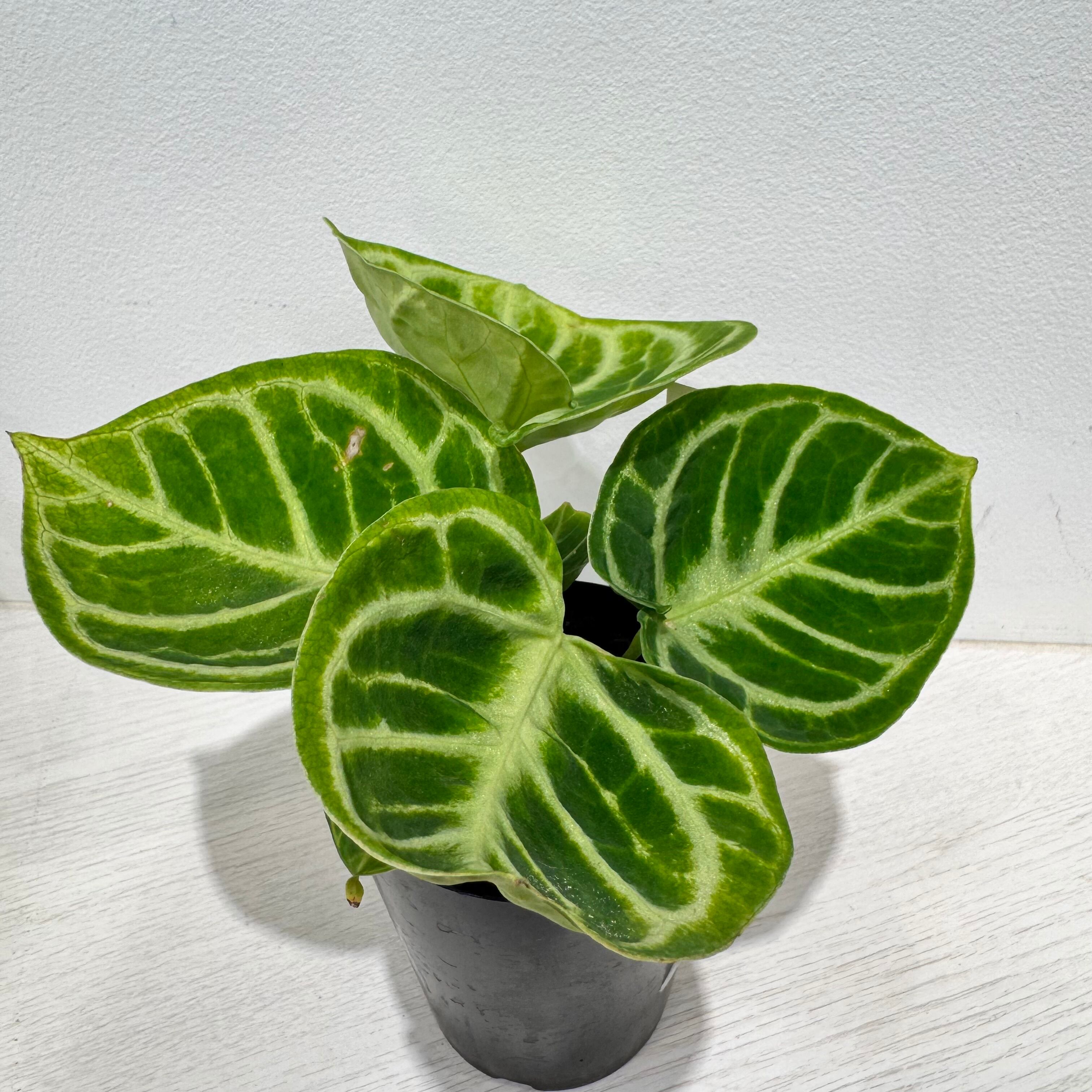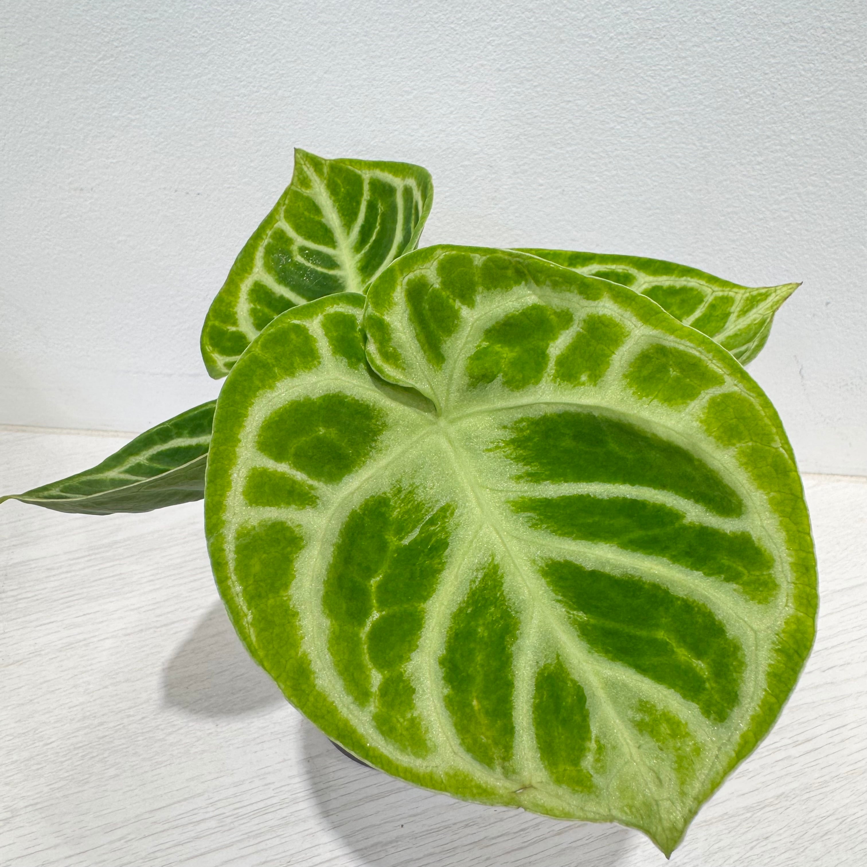 アンスリウムの中では、葉が大きいですが、中〜小型の種類になり、子株をふいたりもします。