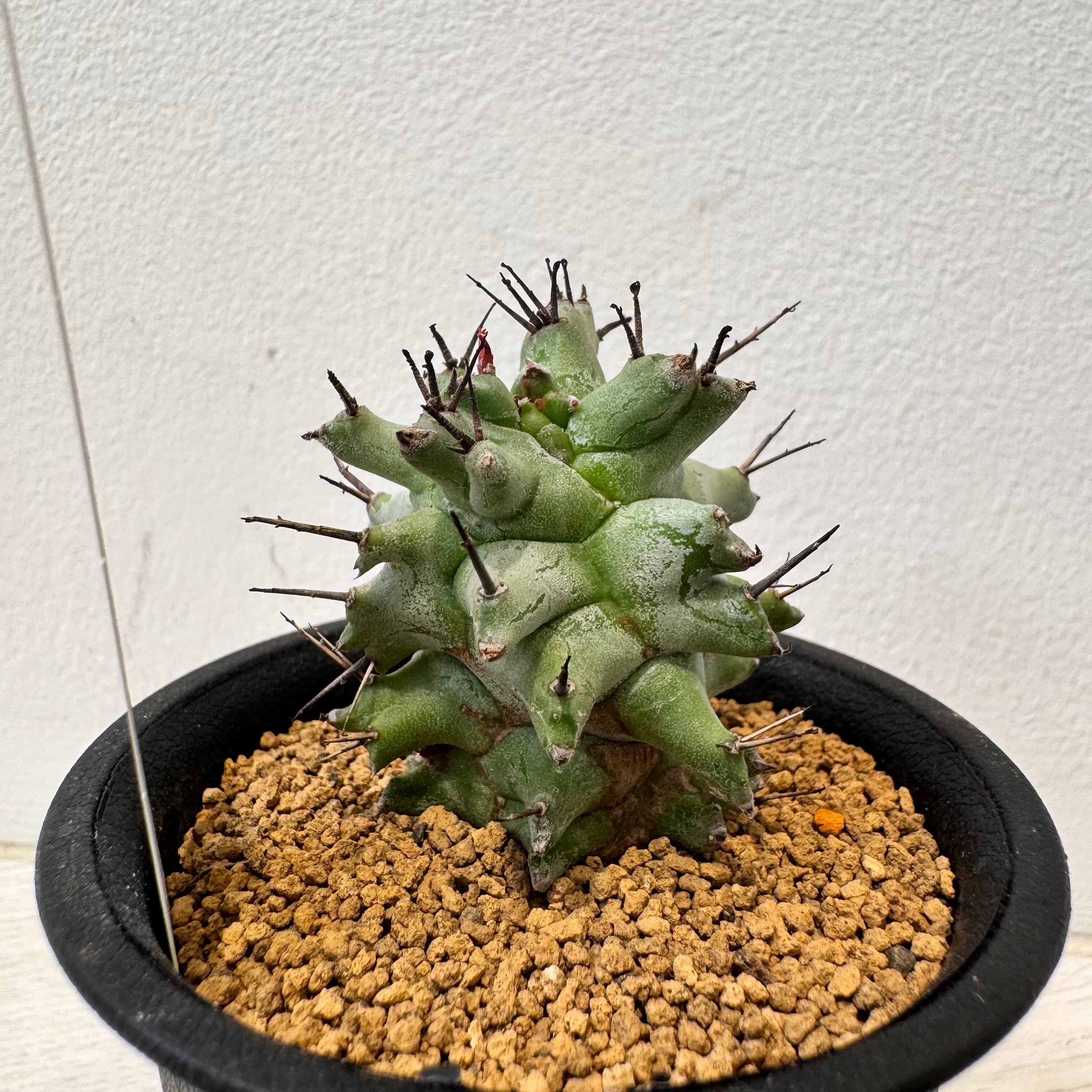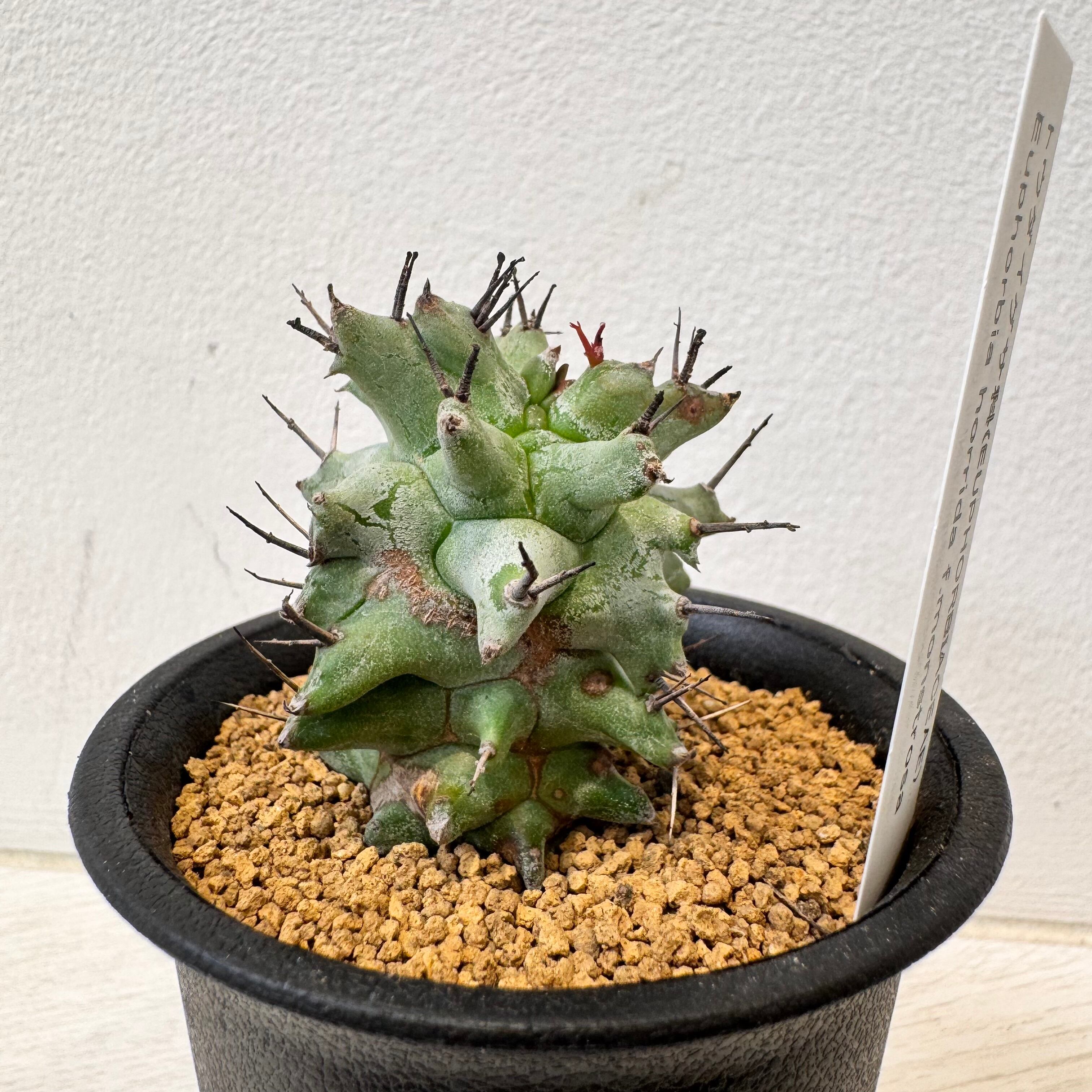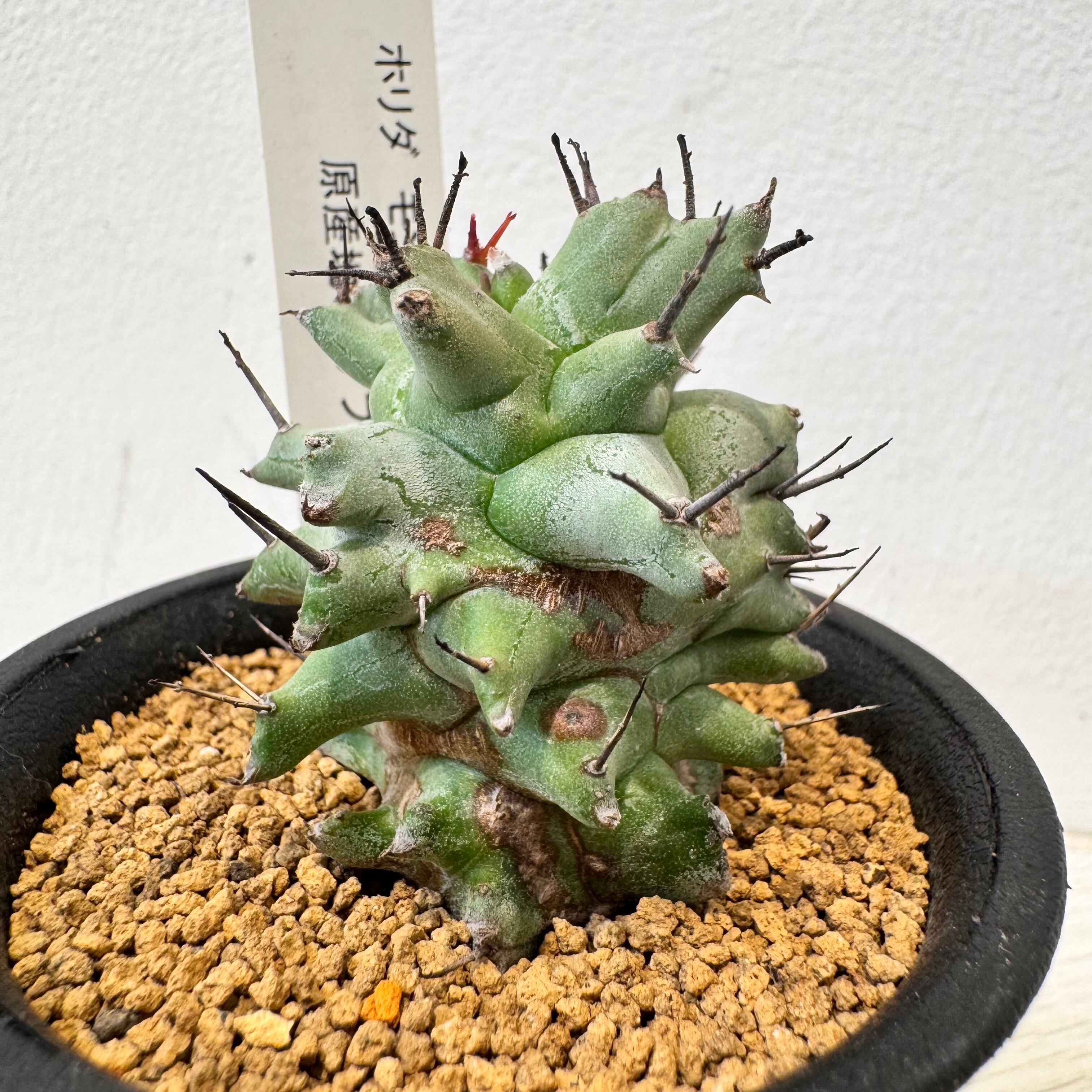 よくサボテンと間違われる事の多いユーフォルビアですが、球型ユーフォルビアには、花座と呼ばれるトゲのようなものが残る種類もありますが、ホリダは花が咲いた後も花座が残り、サボテンのトゲのように見えます。この花座は枯れた後も残りますが、触ったり風に当たって取れてしまう事があります。