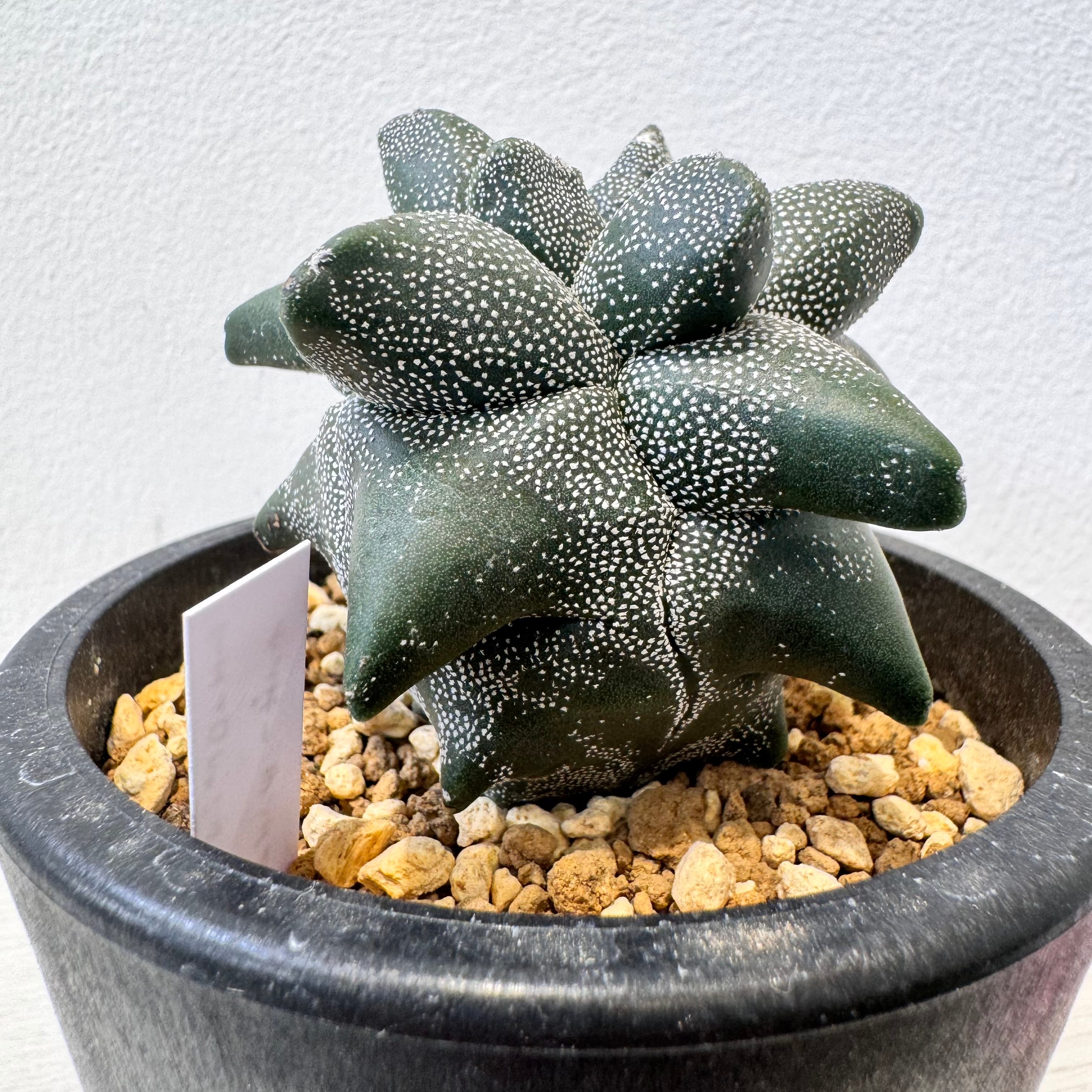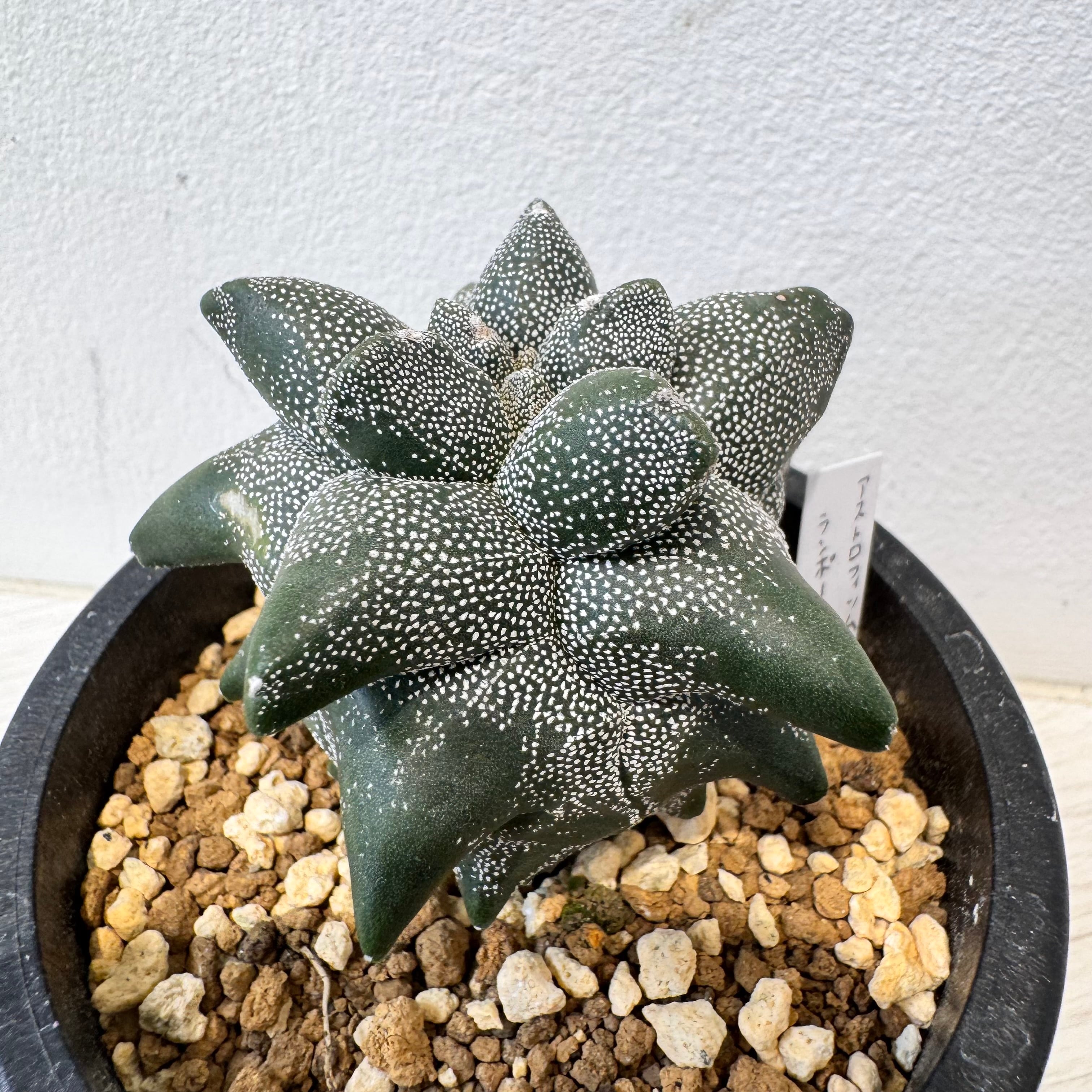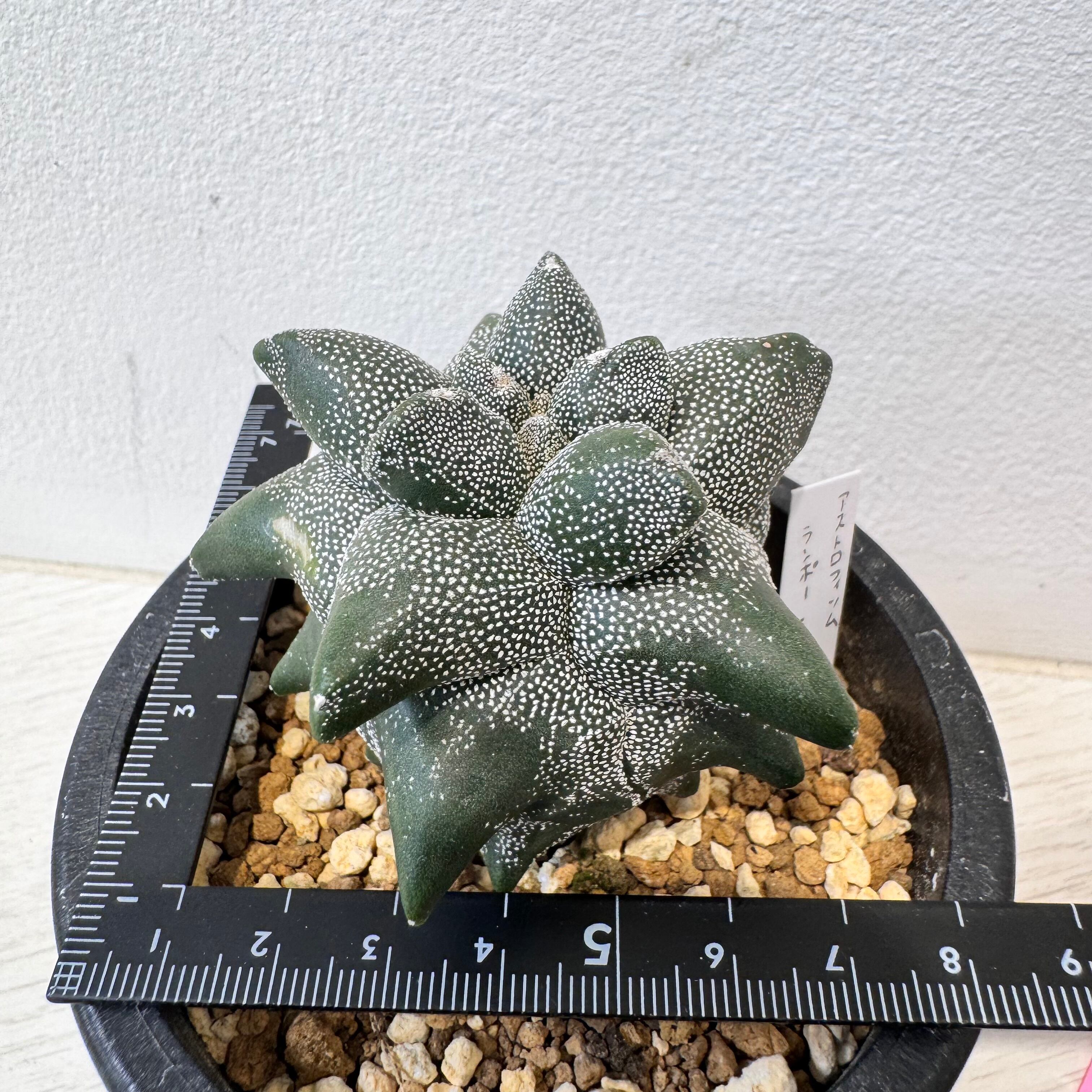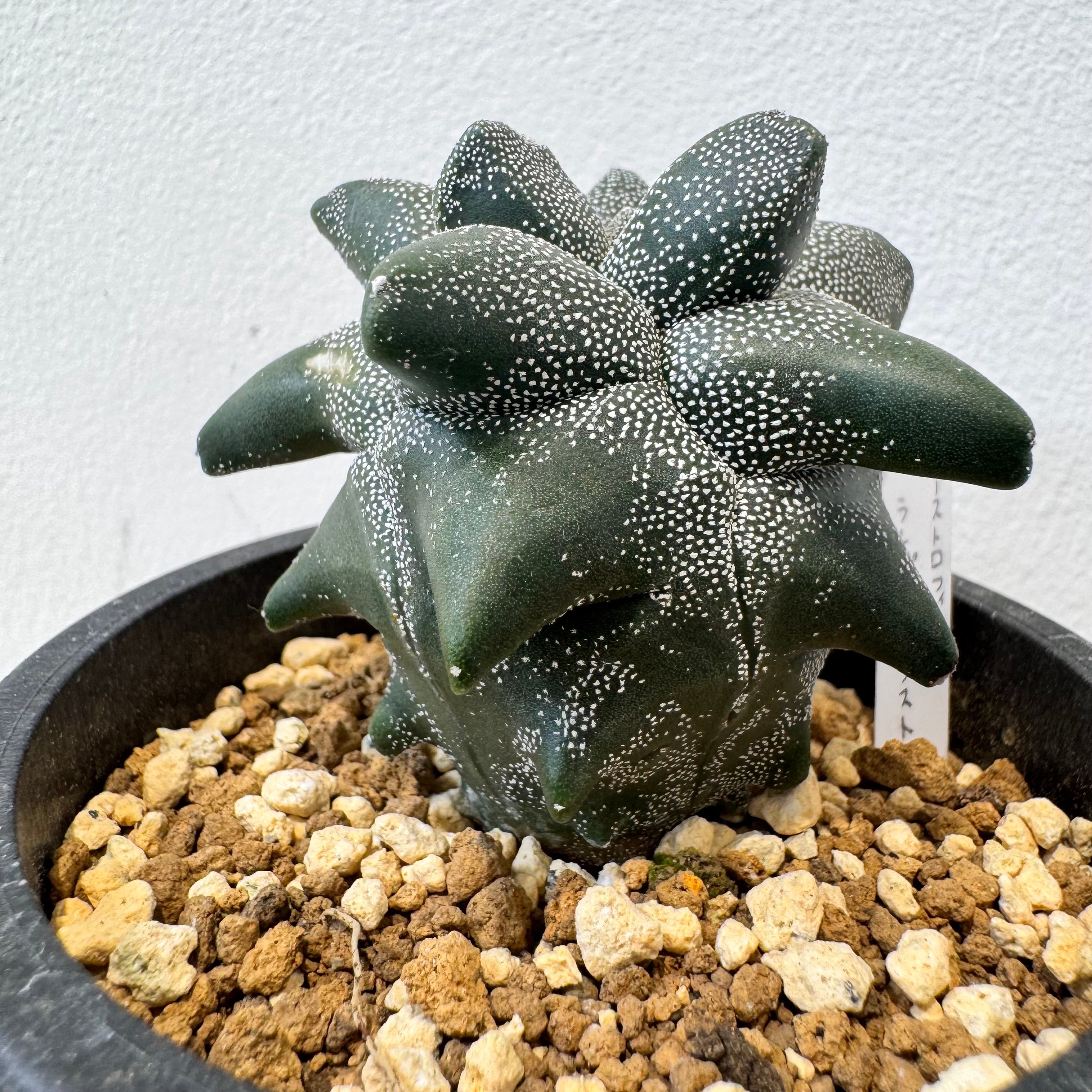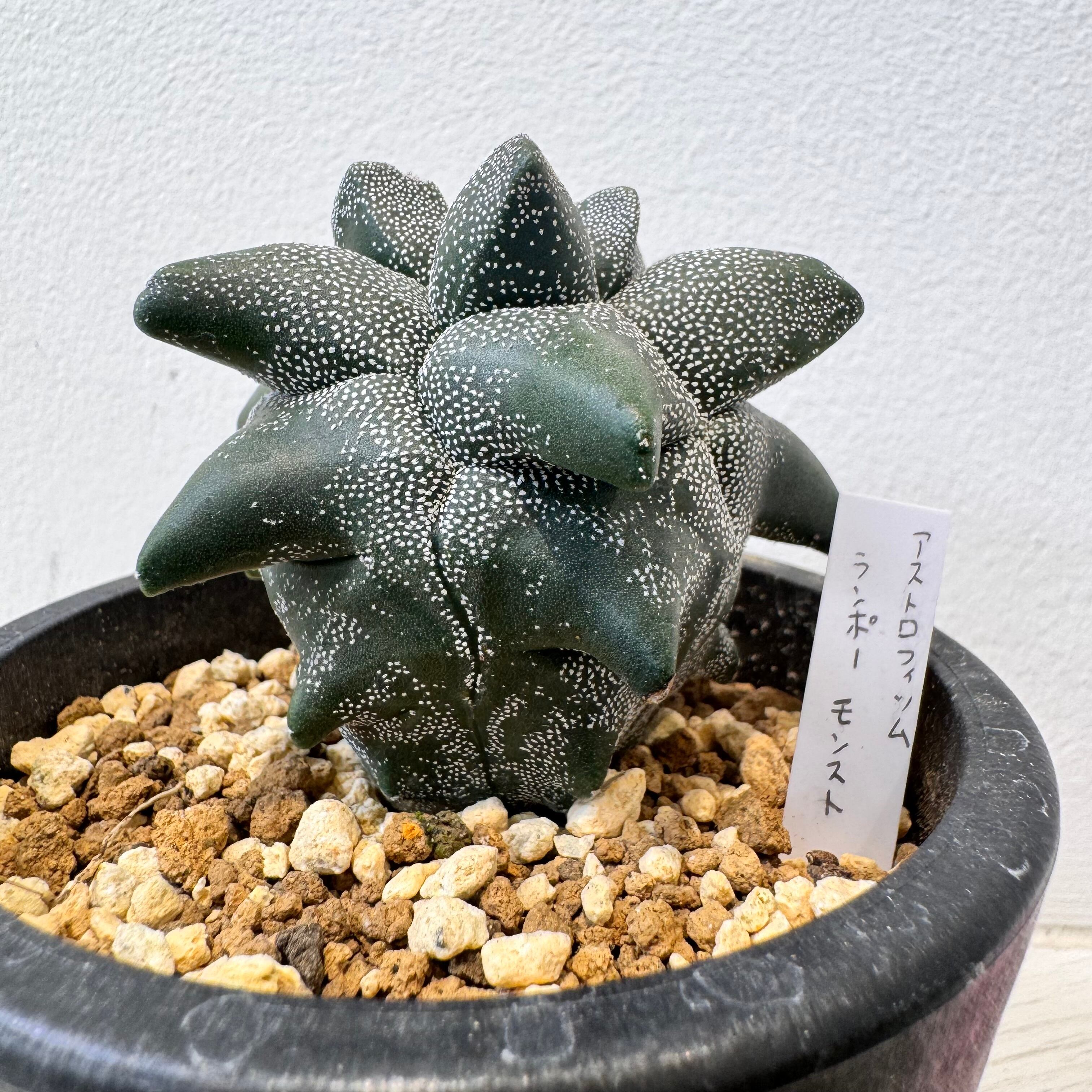 トゲのないサボテンの一種で、サボテン本来、トゲのある棘座(しざ、アレオーレとも言う)の部分に綿毛を持っていますが、ランポー玉も特徴的にハッキリと棘座が確認出来る物、出来ない物があります。白い白点の部分も濃い個体や薄い個体があります。